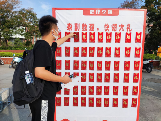 学院将思政教育与迎新工作相结合,推出了以“来数理,领大礼”为主题的“红包墙”迎新活动。每一个红包中都装载着学院辅导员的寄语,并附赠学习用品、书籍、爱国题材电影票等不同礼品的奖券。为了便于学院领导老师及时了解新生学习生活情况,加强与新生的互动交流,学院特地在红包中设置了5份“与学院领导老师共进午餐”预约券。B数据211班新生陈厚铭说:“从东门到接待点,热心的学长学姐就陪着我搬行李、测体温、验健康码、报到注册、领取开学材料,给了我一种从未有过的亲切感。”B统计211班孙晶说:“拆开红包,收到了辅导员老师温馨的祝福,同时自己还中了大奖,学院领导老师后期将会和我一起用餐,说实话是既激动又紧张,很期待和学院领导老师一起用餐的机会。”家长们表示,一开始很担心孩子适应不了陌生环境的生活,但是优美的环境、学校热情的服务打消了他们的顾虑,相信孩子一定能够很快适应大学生活。