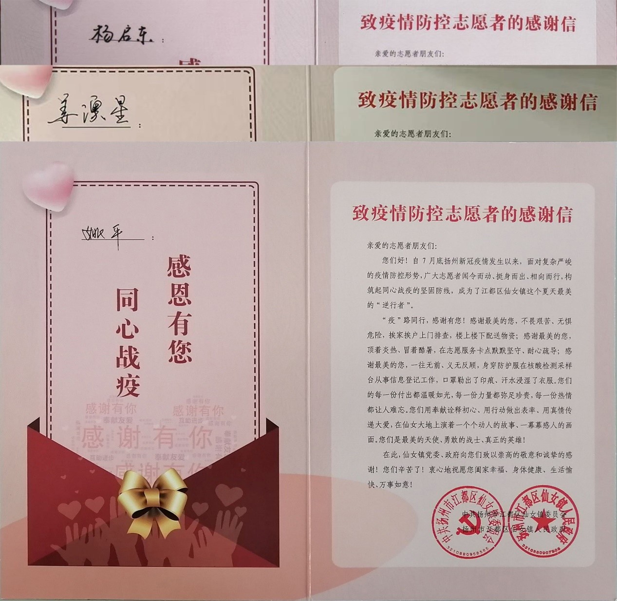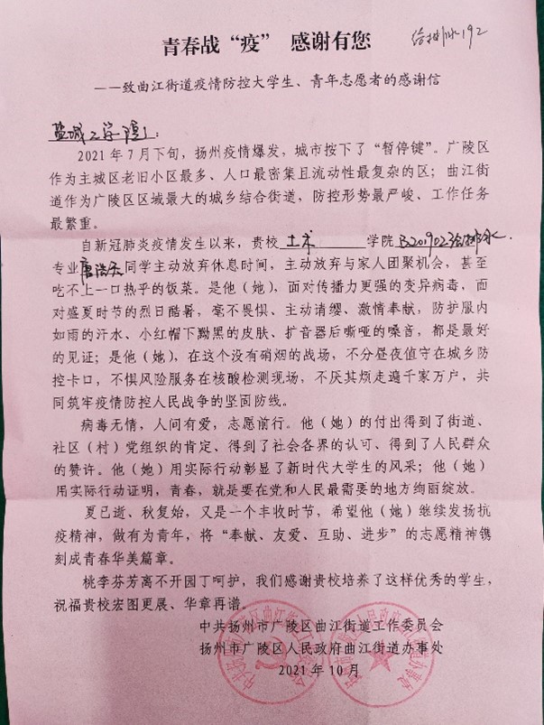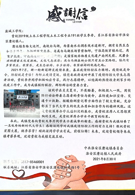 “疫情就是命令,防控就是责任。”近日,盐城工学院土木工程学院党委陆续收到全省各地区、街道和部门寄来感谢信,感谢大学生志愿者在疫情爆发的风险地区,充分弘扬“奉献、友爱、互助、进步”的志愿精神,主动放弃暑期休息时间,放弃与家人团聚机会,面对盛夏烈日,为疫情防控增设一道安全防线,成为居民群众的“守护者”。