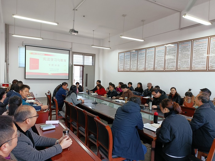 12月1日下午,在南校区博学楼A504会议室,马克思主义学院组织开展“宪法宣传周”专题学习会,党总支书记、常务副院长钱长锋主持学习会,思政课教师兼律师王士权作专题培训,全体教职工参加学习。