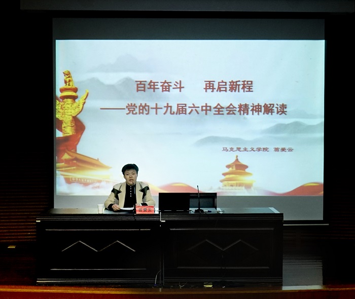 12月8日晚,在南校区润美楼报告厅,设计艺术学院举行“永远跟党走 奋进新征程”主题宣讲活动,校马克思主义学院教师翁爱云以《百年奋斗再启新程——党的十九届六中全会精神解读》为题作专题报告。学院学工办副主任顾清主持,全体大一新生参加。