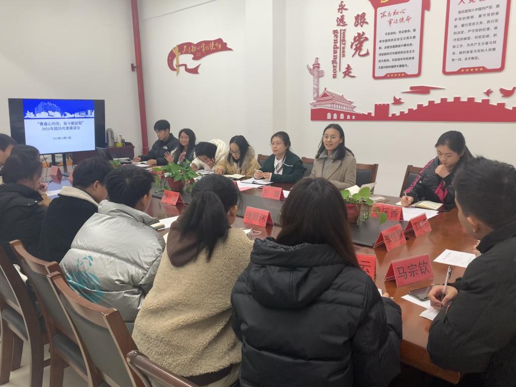 为进一步加强我校基层团组织建设,助力规范、高效完成团工作,12月21日晚,校团委在希望大道校区团委会议室召开“青春心向党,奋斗新征程”2021年团员代表座谈会。校团委书记杨秀丽、副书记方璇、校团委全体工作人员和各二级学院团员代表参加会议。