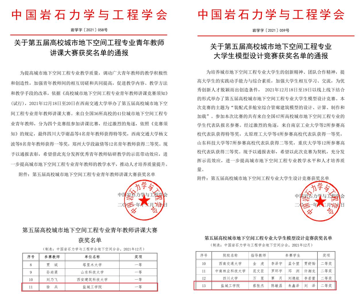 土木工程学院城市地下空间工程专业师生以线上线下相结合的方式参加本次研讨会暨两项赛事。徐兵老师在青年教师讲课大赛中获一等奖;蔡张杰老师指导,陈敏昌、朱鑫泽、刘泽三名同学在大学生模型设计竞赛中获二等奖。会上,还表彰了全国城市地下空间工程专业优秀毕业生,我校城市地下空间工程专业2016级学生冯哲源和2017级学生许龚成、何淼获此殊荣。