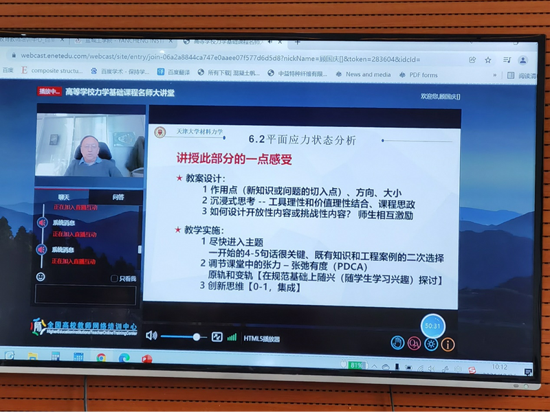 全体教师首先学习了由教育部高等学校力学基础课程教学指导分委会主办的高等学校力学基础课程名师大讲堂的专家报告,报告结束后,与会教师就力学课程教学方法创新、一流课程建设、全国周培源力学竞赛等议题开展力学教学研讨。活动激发了我校力学课程教师教学的内生动力,增强了力学教科研团队的凝聚力,推进了基础力学课程建设。