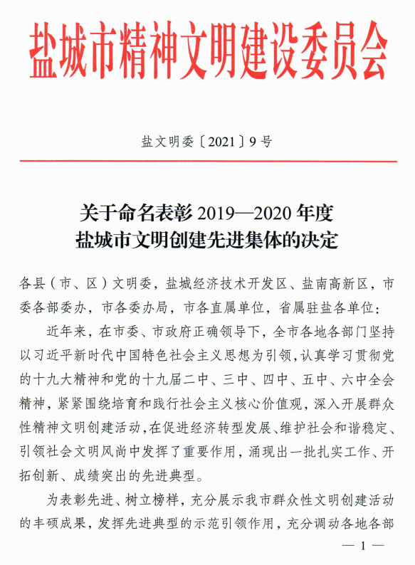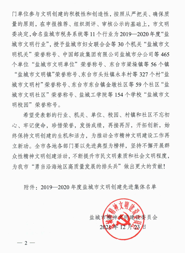 12月23日,盐城市精神文明建设委员会发文(盐文明委〔2021〕9号),表彰我校为2019-2020年度“盐城市文明校园”。