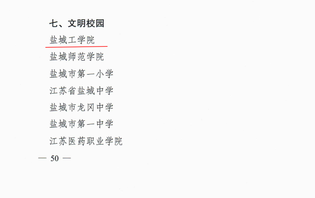 2019-2020年,我校党委和行政在盐城市委市政府、盐城市文明委和省主管部门的正确领导下,认真贯彻落实习近平新时代中国特色社会主义思想和党的十九大精神、十九届四中五中全会精神,全面落实新时代立德树人根本任务,切实把精神文明建设提到更加突出的地位,全校上下积极努力,以创建促文明,以文明促发展,扎扎实实开展文明校园创建工作,在思想道德建设、领导班子建设、教师队伍建设、校园文化建设、优美环境建设、活动阵地建设方面取得了明显成绩。《中国大学评价》排行榜显示,我校位列全国大学综合实力排行第285位,在2019年的第291位的基础上提升6位,连续两年进入大学排行300强。我校获此殊荣,是市委市政府对我校办学育人的高度认可与充分肯定,是全体师生员工团结拼搏、共同努力的结果。