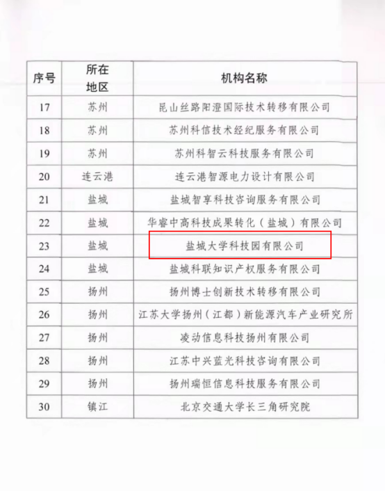 近日,江苏省科技资源统筹服务中心联合江苏省技术产权交易市场联合下发《关于公布2021年江苏省技术产权交易市场技术经理人事务所认定名单的通知》,盐城大学科技园有限公司经申报推荐、资格审查、信用审查及专家评价等程序成功入选为江苏省技术产权交易市场技术经理人事务所。