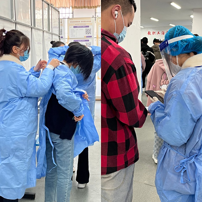 13时10分,所有志愿者均已到达相应场地,进行核酸检测现场布置,确保核酸检测前期工作落实到位;14时左右,参加核酸检测学生陆续到达采样现场,志愿者立刻组织引导同学们有序排队入场,确保核酸检测工作高效有序开展;为了确保信息录入准确,身穿防护服的志愿者按序扫取待检同学的采样码,并提醒同学们戴好口罩、注意距离。
