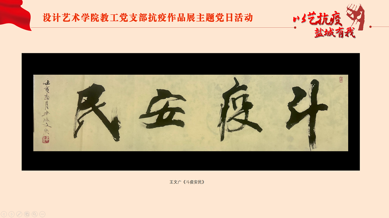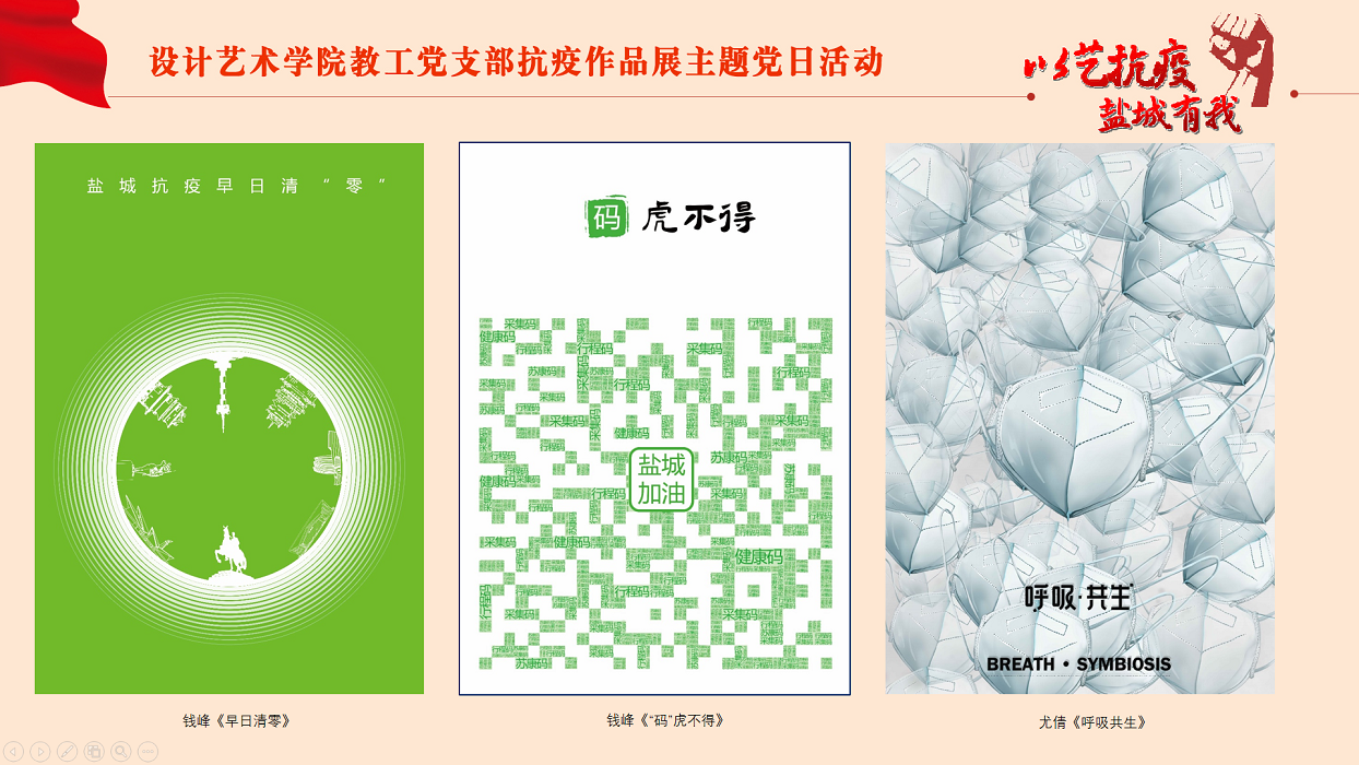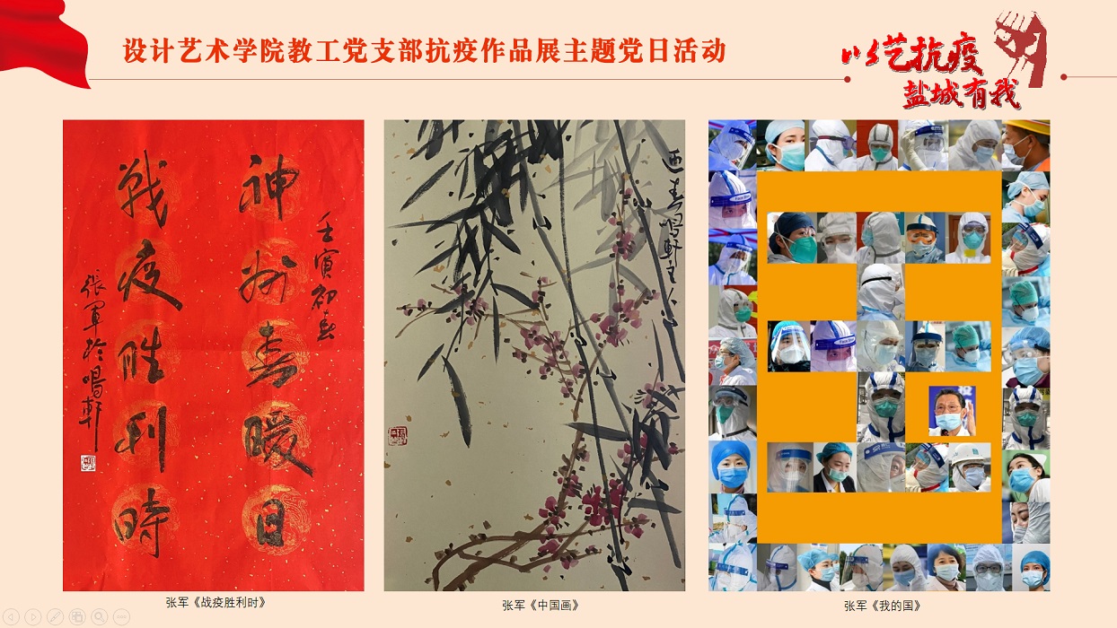 为进一步弘扬“生命至上,举国同心,舍生忘死,尊重科学,命运与共”的伟大抗疫精神,落实上级有关抗疫文件要求,助力开展防疫宣传工作,3月30日下午,设计艺术学院教工党支部在网络云端举行“以艺抗疫,盐城有我”抗疫作品展主题党日活动。活动由党支部书记钱峰主持,支部全体党员参加。