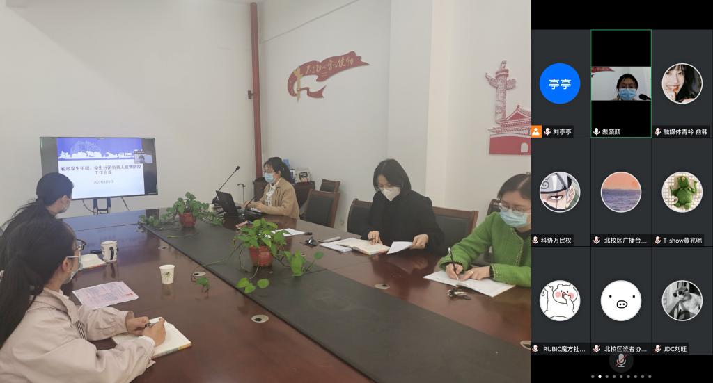 会上,杨秀丽传达了学校疫情防控工作具体要求,对青年志愿者协会、校新媒体等组织在疫情防控工作中所作成绩给予肯定,希望各学生组织和学生社团在学校疫情防控工作中贡献力量,并鼓励各组织、学生社团围绕“喜迎二十大、永远跟党走、奋进新征程”团干部思政技能大比武活动等学校团委工作重点以及疫情防控相关工作中心,积极组织开展精品线上活动,丰富校园文化生活。