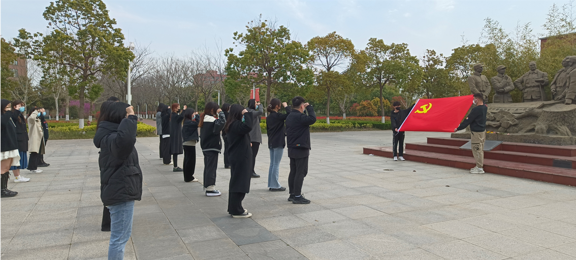 活动开始,全体肃立,向革命先烈默哀一分钟。学生党员们通过瞻仰铁军广场纪念碑与重温入党誓词等方式,缅怀革命先烈、表达对革命先烈的哀思。学生党员代表B英语181班茅妤婷同志表态发言:“我们的烈士们,他们的肉体虽已逝去,但他们那可贵的、崇高的精神却像一团巨火燃烧着,永不熄灭……我们将永远铭记和颂扬革命先烈的事迹,继承先烈的遗志,用自己的生命和才智去实现先烈们未尽的共产主义事业,去创造共和国无限美好的明天,为共产主义事业奋斗终生!”预备党员代表B英语192班林嘉惠同志向大家介绍铁军广场“青松傲雪”雕像的由来,并带领全体学生党员一同学习革命烈士英勇事迹。她表示:“在战争中形成的‘铁军精神’,是历史馈赠盐阜人民的精神遗产,也是盐城工学院的宝贵财富!”