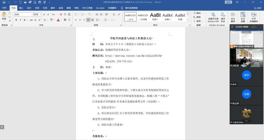 为全面掌握机械优集学院学科现有基础和特色优势,找准学科建设存在的差距与不足,4月15日下午,机械优集学院召开学科建设与科技工作推进大会,本次会议采用腾讯会议的方式进行,院长周临震,副院长宦海祥,校属研究所全体成员参与会议,会议由副院长郑雷主持。