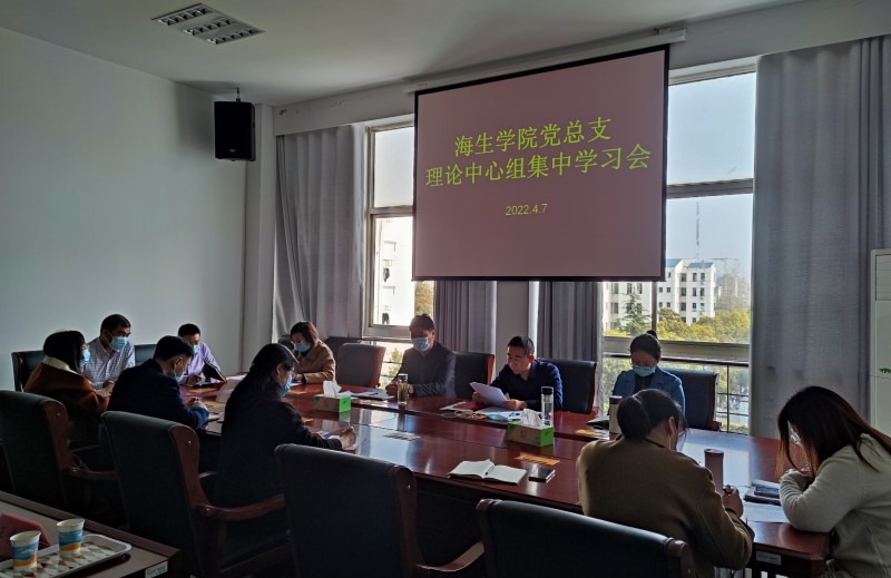 4月7日下午,海生学院在学院会议室召开党总支理论学习中心组集体学习研讨会,党总支书记高留才主持会议,校党委第三巡学旁听组组长张雷、成员束安娣到会指导,学院党总支理论学习中心组成员参加。