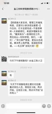 材料学院党委将守护师生生命和身体健康视为当前压倒一切的重要政治任务。封闭校园后,学院党委书记唐浩、院长奚新国等领导带头入驻校园,科学防疫,与学生开启24小时相处模式,全力守护平安校园。