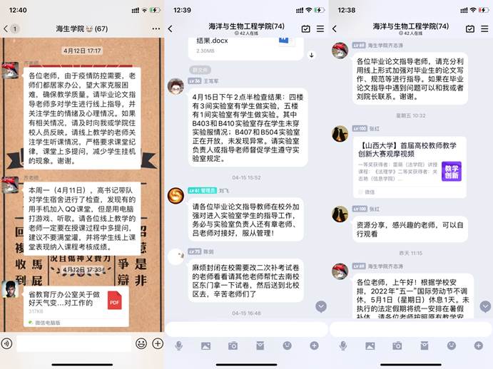 驻校老师深入宿舍了解学生网课期间存在的问题,学院采取督导听课、要求任课教师上课增加抽查、严格课程考察等方式加强封校期间学风建设。副院长齐志涛多次在线上会议中强调“全院教师要克服困难,确保线上教学质量,要关心学生情绪与心理健康并及时与辅导员老师交流沟通。”同时,学院加强对毕业生的论文写作指导工作,充分利用线上形式,规范毕业生的论文写作,帮助毕业生顺利进行毕业论文的撰写。