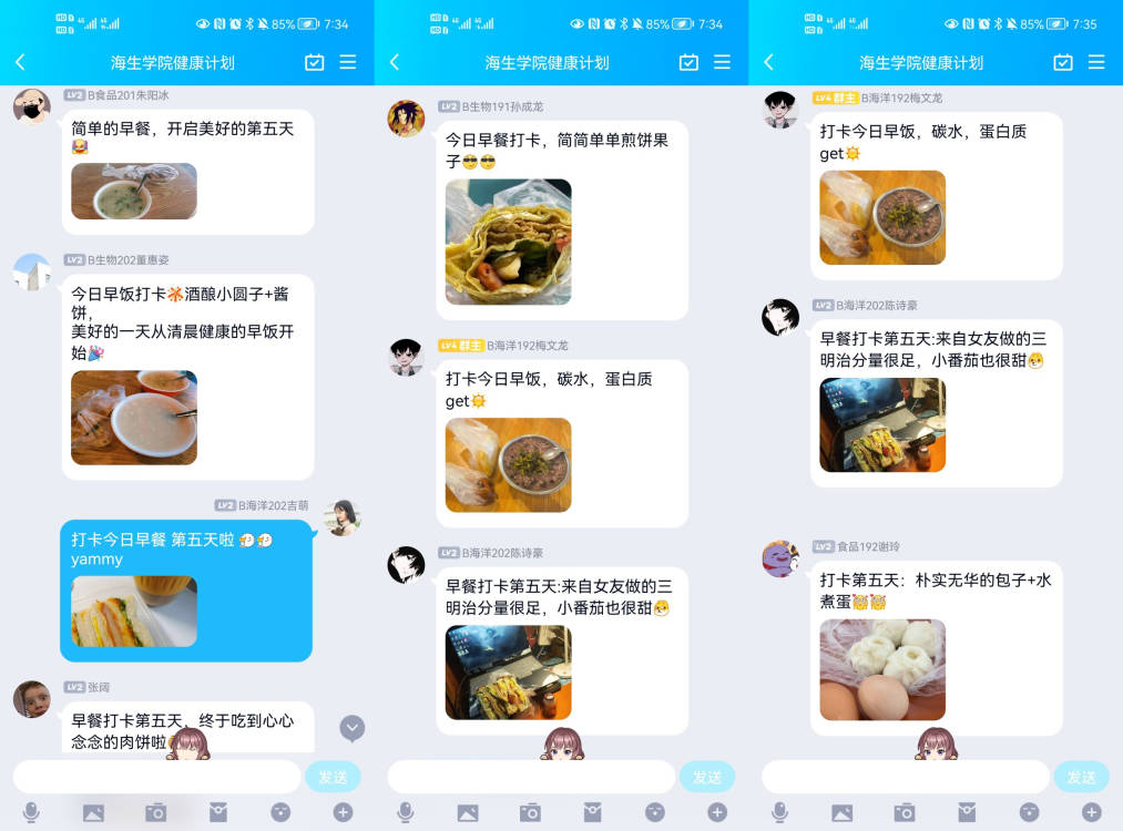 在充分了解学生学习生活基本情况,学生心理诉求后,学院实行乐观生活、提高身体素质的“健康计划”,组建了健康计划QQ群,帮助和督促部分同学养成生活好习惯。学工办副主任郭海松老师先后几次陪同学前往医院就医。三名胃痛的同学引起了他的注意,当得知原因是没吃早饭后,他加入了学生的健康计划,每天督促学生好好吃早餐。同学们也在群里晒出的每日早餐,互帮互促形成健康饮食习惯。学院还鼓励学生早起到操场锻炼,在晚间组织开展抖音健身操直播,让学生他们在操场、在宿舍动起来,有效缓解学生的焦虑心理,提高学生的抵抗力,也进一步增强了师生同心“战疫”的凝聚力。封校以来,为了保障同学们的校园生活安全快乐,由驻校老师、党员学生、学生干部组成的志愿者队伍一直在服务,他们深入宿舍慰问同学,走进食堂关心同学,校园的每一块土地都留下了他们的脚印,校园的夜晚也因为他们的身影变得安全而温馨。