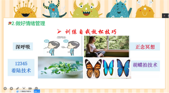 韦春华围绕“确定压力事件、管理负面情绪、调整认知结构、聚焦解决问题”四部分内容展开。针对春学期大学生心理可能出现的危机、日常识别以及专业心理求助资源等方面进行深入剖析,以大学生的现实生活为切入点,设定真实情境下该如何管理自己的情绪,给同学们提供了很多随时随地就能够完成的缓解焦虑与压力的方法,引导同学们做情绪的主人。