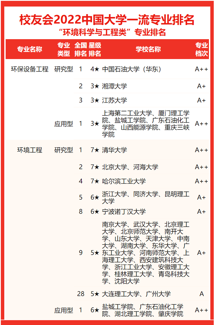 近日,全国第三方大学评价机构艾瑞深校友会网在《2022校友会中国大学排名-高考志愿填报指南》中发布了校友会2022中国大学环境科学与工程类一流专业排名榜单。环境科学与工程学院的环境工程专业在全国应用型环境工程专业排名中位列第1名,为应用型6星专业,专业档次A++;环保设备工程专业在全国应用型环保设备工程专业排名中位列第1名,为应用型3星专业,专业档次A++。