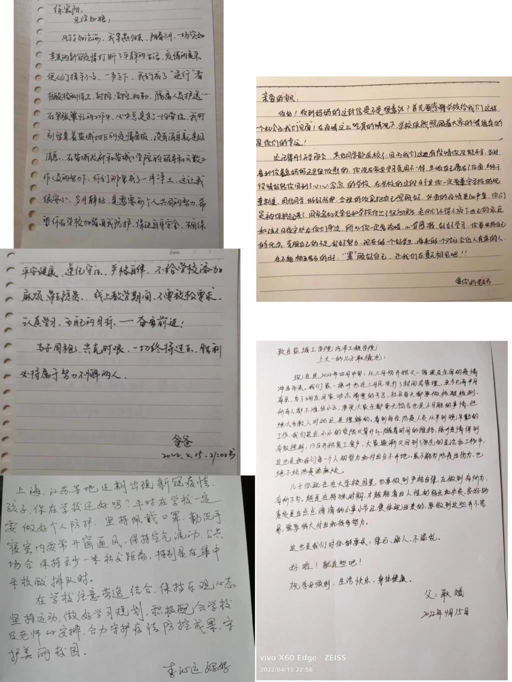 活动一经推出,便得到广大学生家长的踊跃参与。他们纷纷通过亲笔信、短视频等方式为同学们送来了最真挚的祝福。许多21级学生的家长鼓励孩子坚定信念,严格遵守学校疫情防控规范要求,做好个人防护,让家长放心、老师省心、学校安心;同时家长们也希望孩子能学会用心领悟,在困难中学会换位思考、在困惑中学会多方求助、在困境中学会钻研门路。字里行间的情真意切,让同学们在这特殊的时节里有了更多的思考和成长,也汲取了更多的力量和勇气。