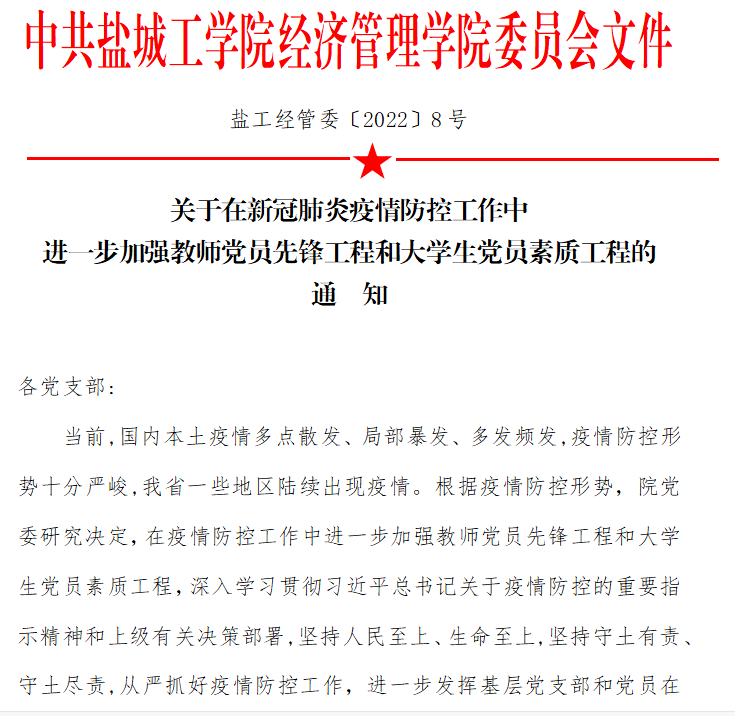 经济管理学院党委向全体党员印发《关于在疫情防控工作中进一步加强教师党员先锋工程和大学生党员素质工程的通知》、《关于建立疫情防控教师网格管理员制度的通知》,全体党员自觉践行初心使命,积极参加疫情防控志愿服务和网格管理员工作,冲在前列、干在实处。广大师生党员在抗疫工作中亮身份、当先锋、树标杆、做表率,勇于承担急难险重的工作任务,带头严格落实疫情防控工作部署和政策要求,带动身边亲属和同学规范遵守各项防疫规定,以自己的实际行动动员身边人、凝聚身边人,把党员奉献服务延伸到疫情防控的“最后一公里”,充分发挥党组织战斗堡垒和党员先锋模范作用,让党旗在防控疫情斗争第一线高高飘扬。