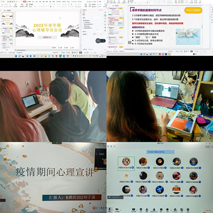 封校期间,大学生校园生活还是略显乏味的。适时关注学生心理健康,缓解学生对学习、未来多方面的焦虑,释放对疫情发展的不理性的恐惧,学院党政高度重视做好学生心健工作,强调封校不停学,封校不封爱。驻校领导和老师在多个场合下都表示要积极关爱学生心理健康,并利用云端会议、宿舍走访、和重点关注学生交流等方式,给学生做“团辅”和“单辅”,指导学生自我调节心理。2022年4月9-10日期间,学院组织学校各班级心理委员线上观看“抗击疫情全国心理委员大讲堂”系列线上公益讲座,并就讲座心得组织线上研讨。