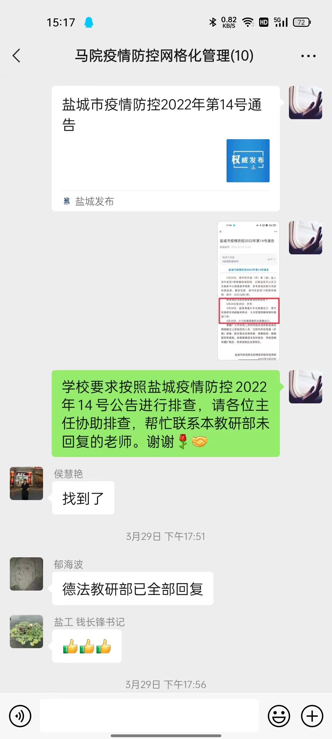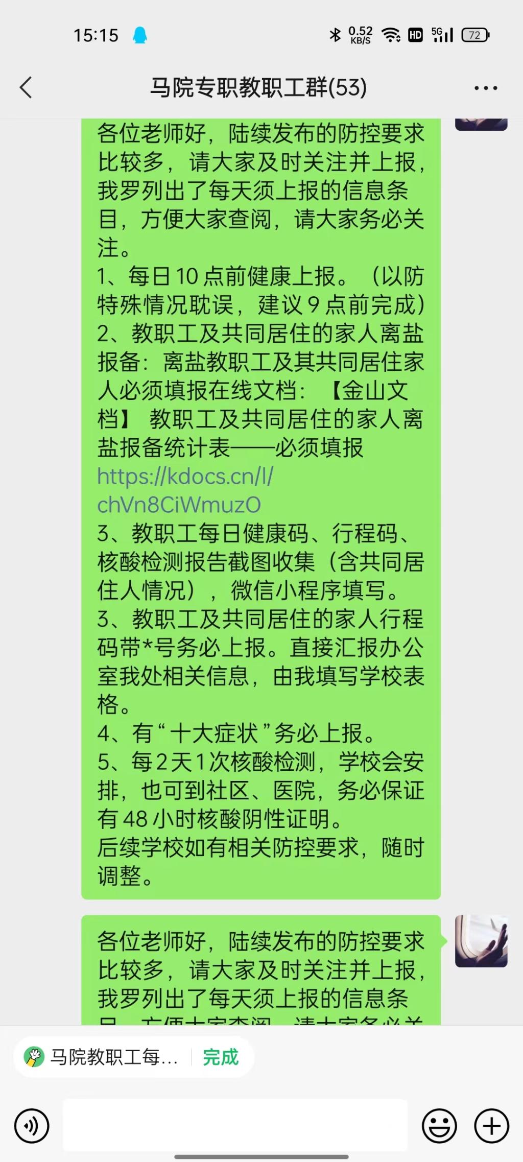 切实做好师生员工知晓疫情防控工作。通过教师QQ工作群及时传达学校、学院的疫情防控精神,积极开展疫情防控工作。切实做到教职工状况摸排到位,精准掌握每位教职工的健康、位置、行程、核酸检测等基本情况,严格实行每日疫情“零报告”制度。
