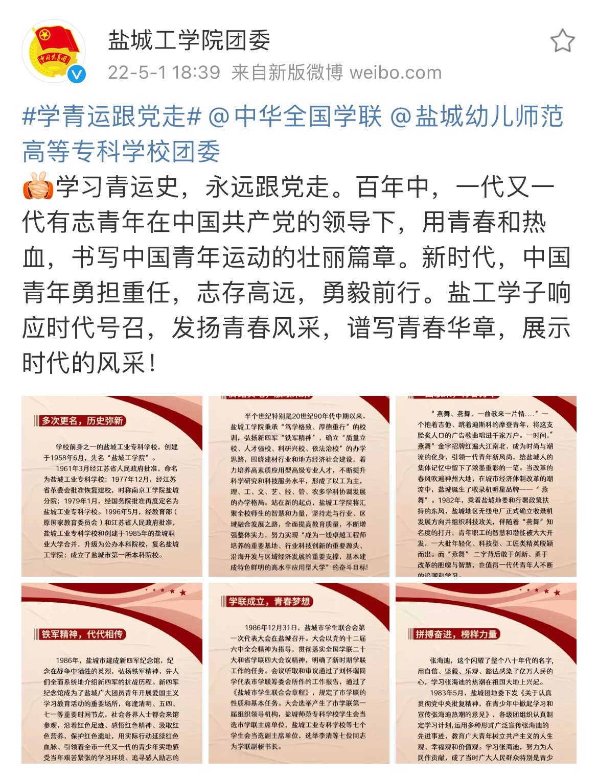 我校学生会积极响应团中央、全国学联号召,参与“学青运跟党走”微博话题接力活动。与盐城幼儿师范高等专科学校团委、学生会共同开展话题接力,共同分享盐城地区的青运史故事。