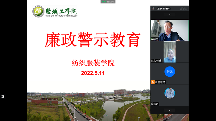 5月11日下午,纺织服装学院开展廉政警示教育活动,本次活动通过腾讯会议线上举行,党总支书记宋孝浜主持,全体教职工参加。