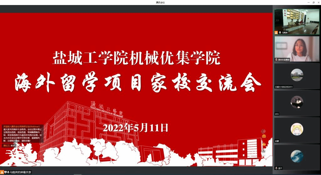 为切实做好疫情防控常态化形势下国合班学生出国留学工作,切实引导国合班学生和家长早规划、早申请、早获得,5月11日晚,在机械馆A223会议室,机械优集学院通过腾讯会议平台开展海外留学项目家校交流会。学院党委书记徐子连出席,国际交流与合作处副处长钱瑛琴,国际交流与合作处雷雅茹,国合班辅导员、大一至大三国合班全体学生和家长线上参会。会议由学院党委副书记马晓英主持。