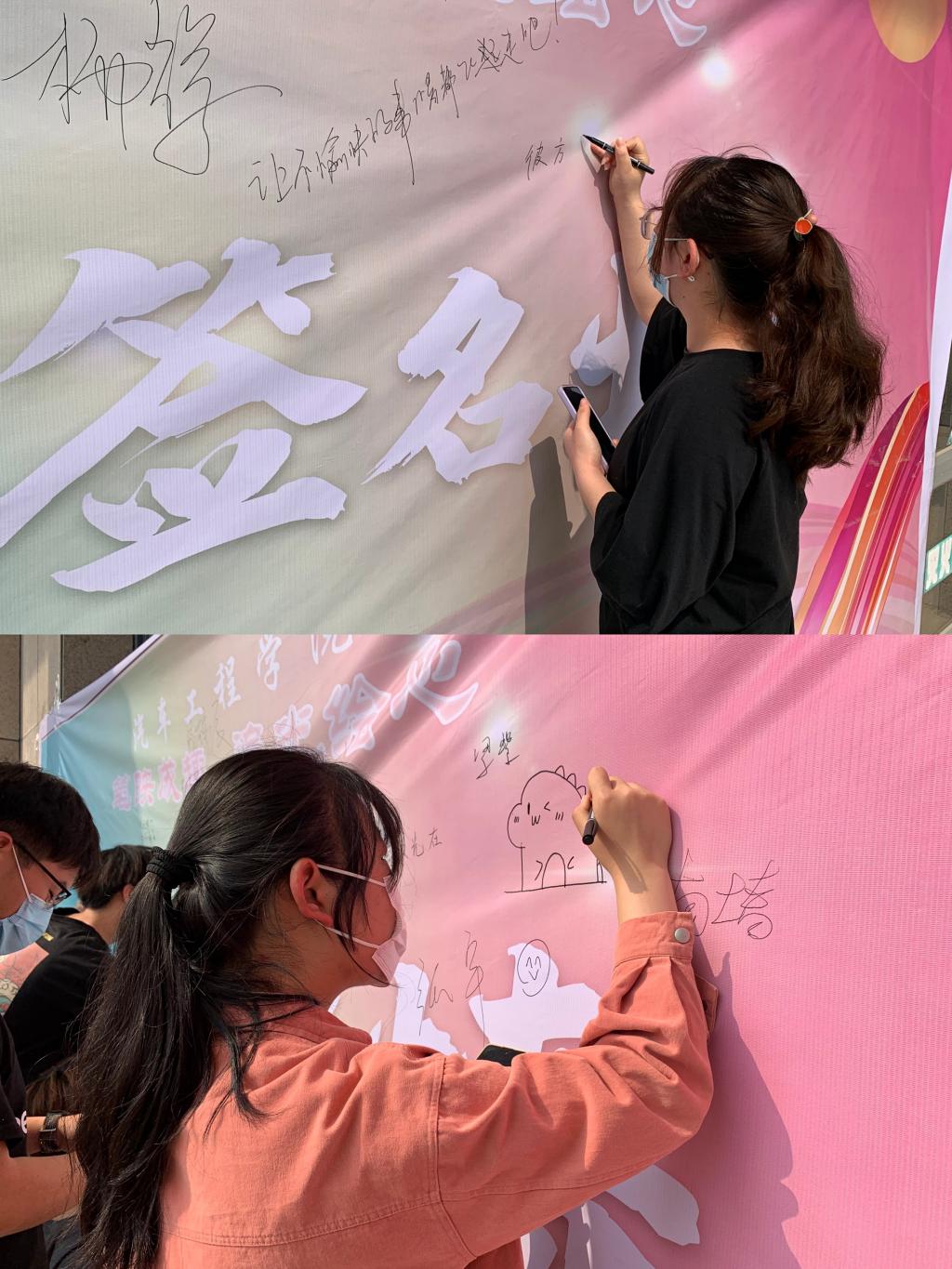 活动一经发出,便得到了同学们的积极响应。全院两百多名学生拿起画笔参与到本次涂鸦当中。活动期间,同学们不仅展示了高超的绘画设计水平,还在作品中展现了积极昂扬的大学生心理素养。涂鸦作品中不仅有对个人美好生活的期待,还有对同班好友真切的鼓励,对学校社会由衷的祝福,营造了“同心共济、向阳生长”的良好氛围。