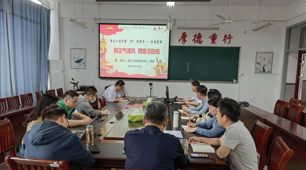 5月26日上午,信息工程学院开展“510”思廉月学习教育活动。学院党委书记王爱军作题为《扬清风正气 守廉洁初心》的专题党课报告,全体党员和中心组成员线上或线下参加了学习活动。