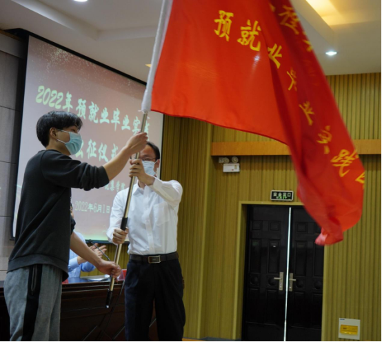 出征仪式上,周临震为2019级预就业毕业实践学生团队出征授旗。他激励学生,要珍惜学习机会,加强学习实践,在企业平台上提升素质,增长本领,为未来优质就业打下良好基础,并预祝2019级预就业毕业实践工作取得圆满成功。