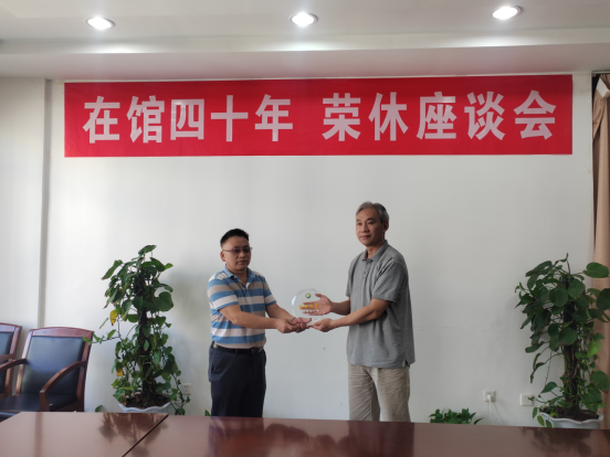 座谈会上,即将退休的戴国荣老师满怀深情回首往事,回顾了在图书馆工作40年的历程以及与同事们一同砥砺奋斗的点点滴滴,他勉励与会工作人员要深植图书馆事业,为学校和图书馆事业的蓬勃发展贡献力量。座谈会中,馆长顾志兰对戴国荣老师40年来对图书馆事业的付出表示感谢,对其即将到来的退休生活表达了美好的祝愿。党总支书记花爱军对戴国荣老师40年如一日,在平凡的工作岗位上做出的贡献表示诚挚的谢意,并希望他在退休后继续关心和支持图书馆事业的发展。
