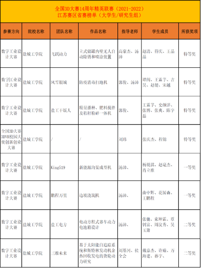 2022年春学期,我校汽车工程学院积极组织学生参加全国、省各类学科竞赛,继5月27日在江苏科技大学举办的“第九届江苏省大学生机械创新设计大赛”荣获三等奖后,又在近期结束的全国三维设计(3D)大赛14周年精英联赛、中国大学生电动方程式大赛和全国大学生节能减排社会实践与科技竞赛中再创佳绩。其中3D大赛,汽车工程学院由近40余名学生组成的11支队伍参赛,最终荣获江苏赛区特等奖4项、一等奖2项、二等奖2项;2021中国大学生方程式系列赛事获MATLAB/Simulink车辆动力学仿真奖—优秀奖 、年度优秀传播团队奖和总成绩三等奖;全国大学生节能减排社会实践与科技竞赛荣获三等奖,以上赛事均进入全国普通高校大学生竞赛排行榜。
