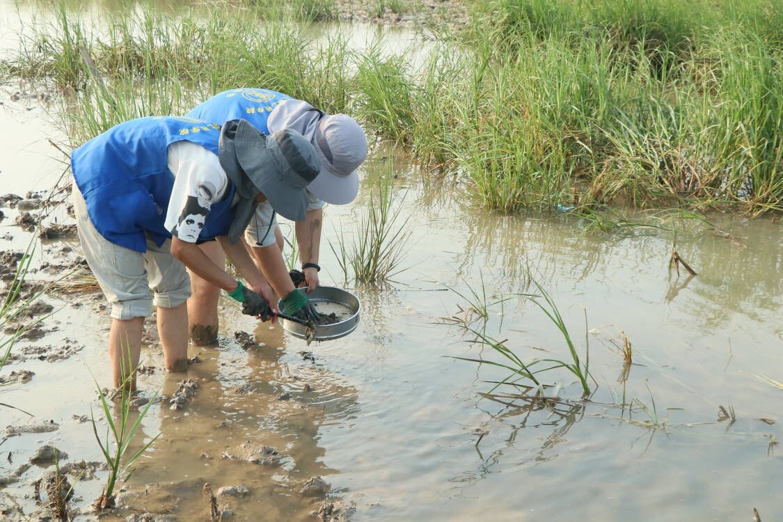 一到黄沙港,大家就全副武装了起来,撸起裤脚,带上防晒帽,拿起捕捞工具,走进了滩涂。隋老师向同学们介绍了滩涂的形成以及它的生态环境,并介绍了基本的捕捞方式。他提到盐城海岸线上有上千种的海洋底栖生物,如我们常见的螃蟹、沙蚕、海螺、鰕虎鱼等。在了解一些知识后,一行人带上自己的装备就向大海进军,B海洋202的瞿彬彬抄网就抓起了“跳跳鱼”。“跳跳鱼”学名又叫弹涂鱼,是虾虎鱼科、弹涂鱼属的一种鱼类。常依靠发达的胸肌柄匍匐或跳跃于滩涂上,退潮时在滩涂上觅食。其移动速度特别快,在海滩上犹如一个弹跳运动员,刚想动手去抓,它就已经跳远了。瞿彬彬来回挥网只捞起来一些水草,满头大汗却毫无收获。B生物202的韦轩见状过来帮忙,“彬彬,你在前面抓,我在后面堵。” “当你看见跳跳鱼的时候,你就已经抓不到它了。”齐志涛在一旁笑道。在老师的点拨下,同学们开始了一顿疯狂的“盲捕”操作,不看位置疯狂捕捞。第一轮捕捞过后,渔网里出现了两条“跳跳鱼”!“跳跳鱼”也被这种没有套路的捕捞法“弄昏了头”,乖乖束手就擒了。