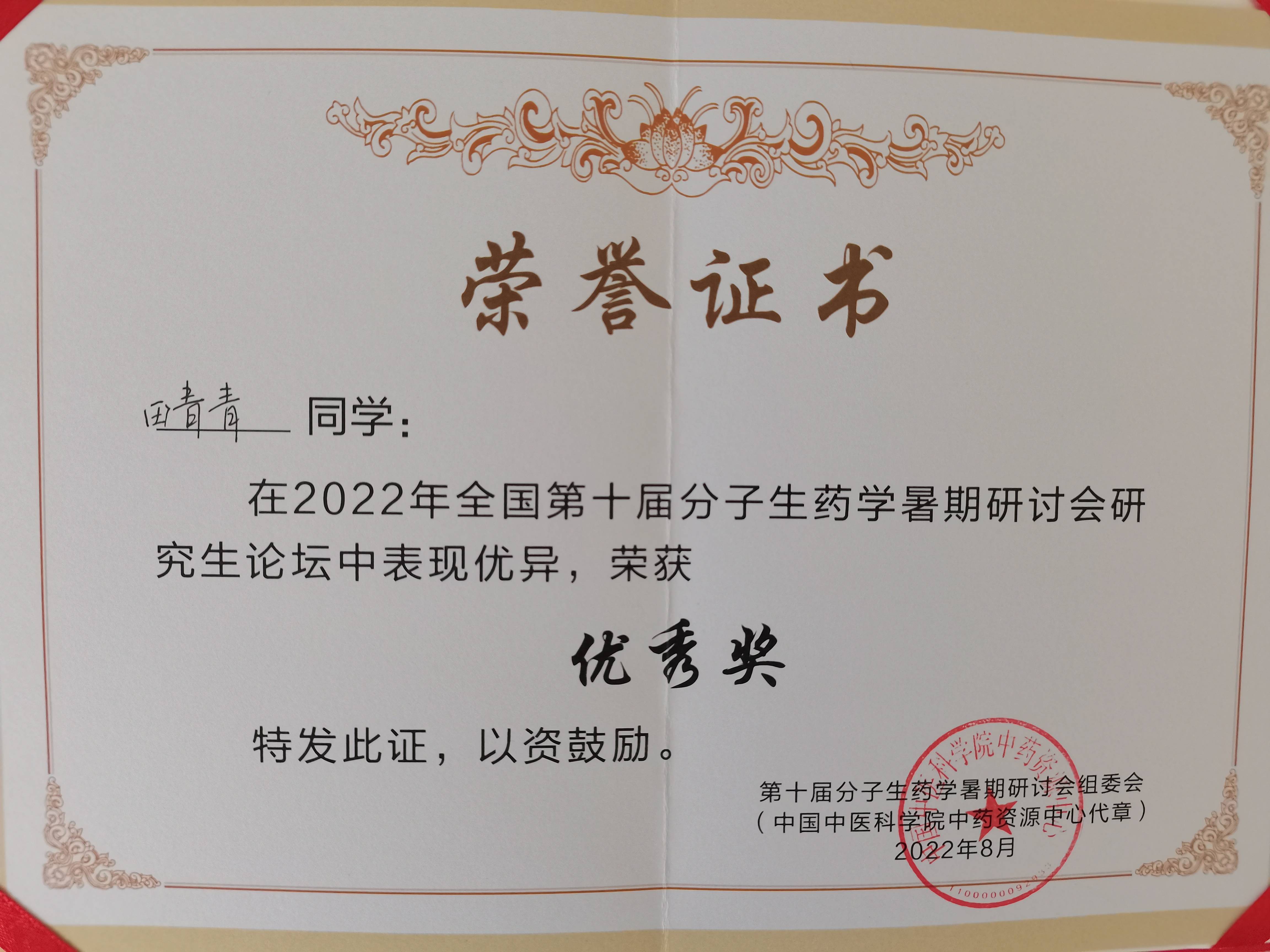 本次论坛在全国范围内遴选了23个研究生报告,田青青同学在研究生论坛环节代表我校作题为《摄食血餐对日本医蛭肠道微生物变化影响的研究》的报告,并获得大会优秀奖。参加本次研讨会,我校生物与医药专业学位点建设方面科研的教师和学生对本学科的最新研究动态以及如何有效运用学科前沿的技术手段有了准确的把握。同时,他山之石、可以攻玉,在与兄弟院校的交流中,为如何促进我校生物与医药学科的高质量发展提供了更宽阔的视野。