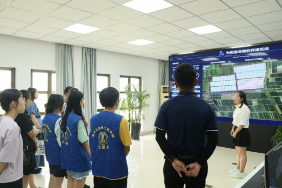 社会实践团队首先走进光明渔业有限公司,在工作人员带领下参观了公司先进的鱼塘数据监控系统和饵料投喂系统,登上参观台观看了万亩的水产养殖基地,详细了解了大丰光明渔业的整体规模和日常生产经营情况。该公司应用大数据的现代化鱼塘管理模式、企业生产运转调度效率极高,监控监管覆盖范围广,从饵料投喂到近期海产品市场营销状况都一目了然,公司除主体现代化鱼塘外,在旁还设有水产品加工厂,工作岗位与学院专业高度契合。参观过后,光明渔业党委书记王军代表公司对海生学院的来访表示热烈欢迎。他对企业目前的生产经营业绩情况进行了简要介绍,并对于双方前期合作取得的成果给予肯定。他表示,盐城工学院海生学院与光明渔业具备良好的产学研究合作基础,将在此基础上合作建立就业实习基地,双方在人才培养、产品研发、项目申报等方面深化合作,实现优势互补、相互促进、共同发展。