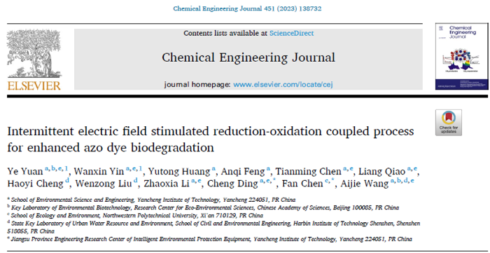 近日,环境学院远野副教授和殷万欣硕士为共同第一作者、丁成教授为通讯作者的研究论文《Intermittent electric field stimulated reduction-oxidation coupled process for enhanced azo dye biodegradation》(Yuan et al., Chem. Eng. J., 2023, 451, 138732)在工程技术领域权威期刊《Chemical Engineering Journal》发表。该期刊2022年影响因子16.744。