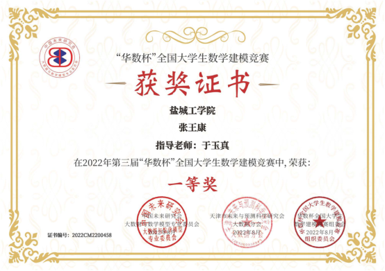 近日,2022年第三届“华数杯”全国大学生数学建模竞赛获奖名单公布。我校机械工程学院研究生王昊、赵金库、张王康三位同学组成的一支参赛队伍获得研究生组一等奖,指导教师为于玉真教授。