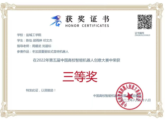 8月28日,第五届中国高校智能机器人创意大赛决赛在浙江举行,我校机械优集学院大一学生陈怡同学作品(周耀武、刘道标指导)《冬加湿夏驱蚊音响机器人》获得江苏赛区一等奖、全国三等奖;顾雨婷同学作品(刘道标指导)《全自动速食机器人》、吴伯焘同学作品(郁倩指导)《智能移动垃圾桶》、吴周宇同学作品(周耀武指导)《智能鞋柜》获得江苏赛区三等奖。