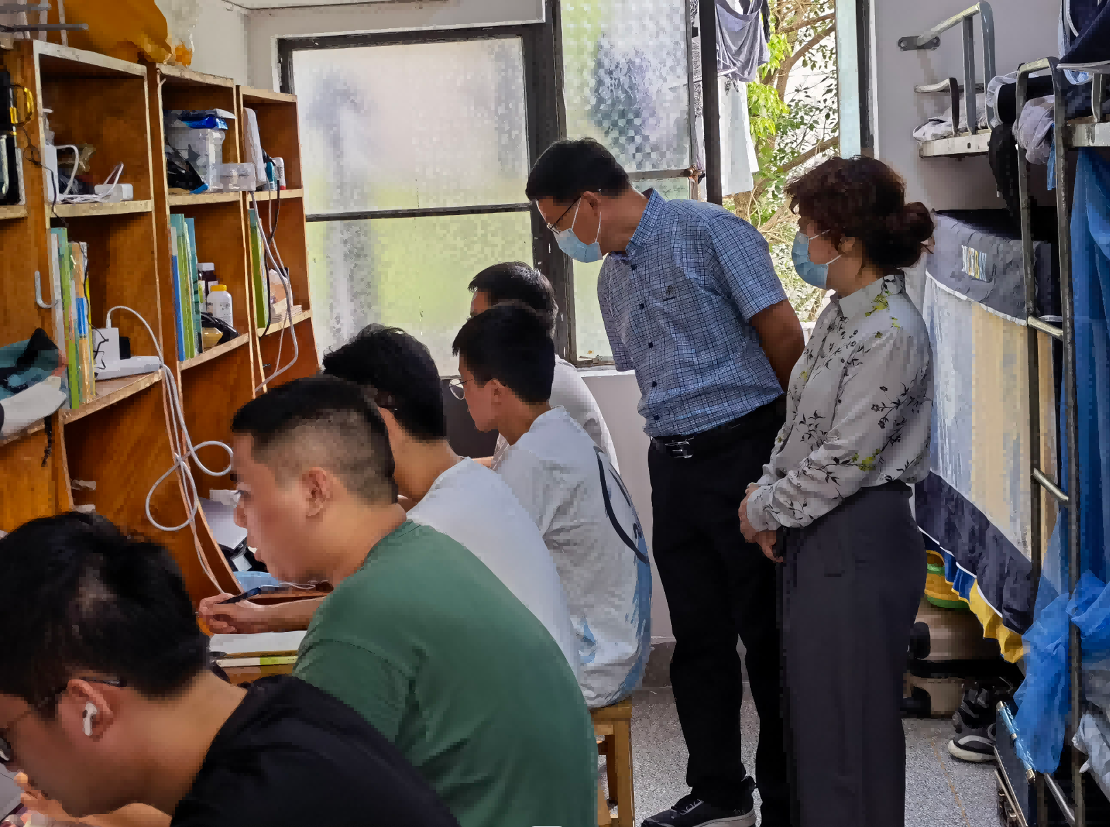 走访过程中,学院领导与同学们进行亲切交谈,热情询问同学们的家乡状况及新环境的适应情况并对新生们的到来表示欢迎。周晓燕详细了解新生线上上课的情况,耐心地向大家介绍人文学院各专业的特色与优势,传授高效的学习方法。她希望同学们能够尽快熟悉并适应大学的校园生活,完成高中生到大学生身份的转变,结合自身做好大学四年的职业生涯规划,不负大学四年美好时光。何登溢详细询问了同学们入学后住宿、学习及生活等方面的需求,并就新生提出的问题进行了耐心解答。他还细心检查了宿舍的卫生安全等情况,叮嘱新生要遵守学校疫情防控规定,提高安全防范意识。他希望同学们要以饱满的精神和乐观的态度迎接大学生活,认真学习专业知识,积极参与校园文化活动,全方位提升自我,努力成为德智体美劳全面发展的新时代青年。