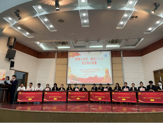 为迎接党的二十大胜利召开,引导广大青年学生加强党史学习,砥砺青春使命,10月12日下午,在建军东路校区五四报告厅,材料学院举办“青春心向党,喜迎二十大”党史知识竞赛。校党委常委、宣传部部长、材料学院院长奚新国,学院党委书记唐浩,江苏博思通新材料有限公司董事长、总经理于浩,学工办负责同志、全体学生党员、发展对象、入党积极分子等100余人参与。