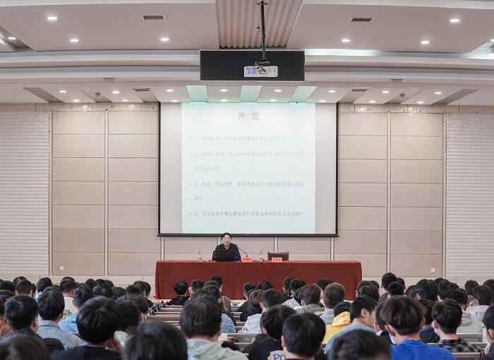 李爱国围绕学籍教育管理,介绍了绩点的计算,课程考核流程,休、退学手续办理,学位授予条件等内容。他希望同学们要主动学习、善于学习、经常向老师请教,努力学习,锻炼自身能力,为进入社会工作铺垫。他还要求各位同学在平时养成良好的学习习惯,在考试前要认真准备复习,诚信考试,不触碰红线。