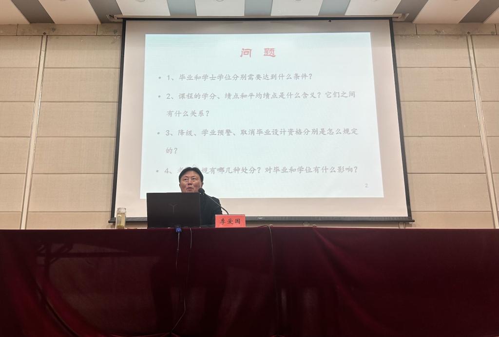 让大学生充分了解学校的学籍管理规定,是保障大学生顺利毕业的前提。李爱国分别从毕业和学士学位需要达到的条件,课程的学分、绩点和平均成绩的含义和关系,降级、学业预警、取消毕业设计资格的规定,考试违规的处分类别以及对毕业学位的影响等四个方面进行了阐述。李爱国希望同学们能牢记学校学籍管理规定,为同学们分析考试作弊需要付出的直接成本和潜在成本,并告诫同学们要认真学习和诚信考试,切勿虚度大学四年光阴。