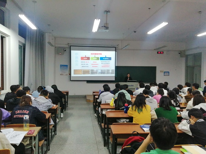 柏昕首先向同学们展示了以往的优秀毕业设计作品,并用历届优秀学长学姐的事迹来为他们指明前进的方向。接着她从服装专业的就业前景、专业人才培养目标、课程体系与专业特色、师资队伍、实验室、实习基地等方面做了重点介绍,对整个专业进行了深入全面的剖析,同时也指出了同学们可能会遇到的各种问题,帮他们规避一些思想误区。最后她鼓励同学们转变思想、树立信心,做好人生职业学习规划,养成良好的行为习惯,励志成才。