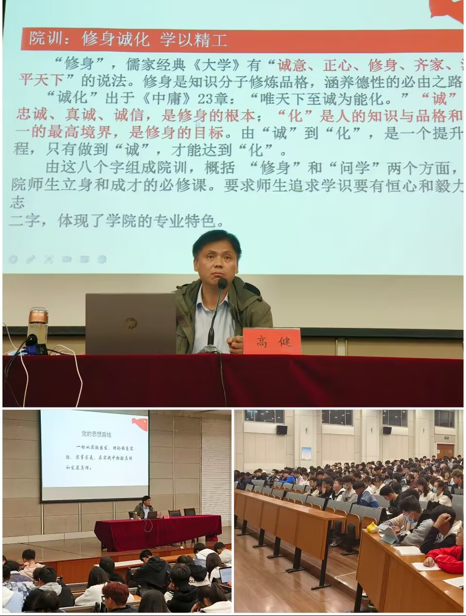 向党而行,锤炼优良品质。高健以党的基本知识和理论作为切入点,就如何具备党员条件和入党程序进行详细讲解;从院训“修身诚化,学以精工”出发,强调“修身”和“问学”是全院师生立身和成才的必修课。他希望各位同学追求学识要有恒心和毅力,修炼品格要立身以诚,矢志不移,追求化境。讲座从领悟政治、学会关爱、善于沟通、严于自律以及有志气、底气和骨气等五个方面,告诫同学们要树立远大理想,坚定政治立场,学会做人做事,正确处理人际关系,做到严于律己,正确规划未来。本场讲座引来阵阵掌声,内容丰富多彩,讲解生动形象,让同学们受益匪浅。