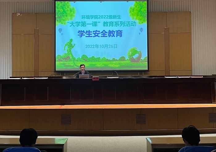 10月26日下午,环境学院在建军东路校区图书馆报告厅举办2022级新生“大学第一课”教育之“学籍管理教育”“大学生心理健康教育”“大学生安全教育”,讲座分别由校教务处副处长李爱国,校学生处副处长、心理健康中心主任韦春华,学院党总支副书记周政主讲。讲座由学院党总支副书记周政主持,2022级新生辅导员徐浩、王翔以及2022级全体新生参加。