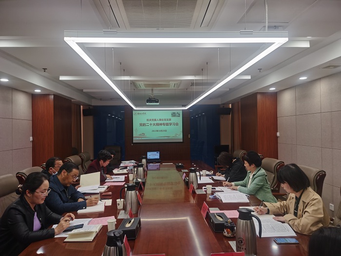 10月28日下午,机关党委人事处党支部在希望大道校区行政楼830会议室以“线上+线下”同步进行的方式召开党的二十大报告精神专题学习会,深入学习习近平总书记在中国共产党第二十次全国代表大会上作的题为《高举中国特色社会主义伟大旗帜,为全面建设社会主义现代化国家而团结奋斗》的报告。人事处党支部书记沈晓梅主持会议并领学,校党委第一巡学旁听组组长孙琴、成员王丽坤参会指导,支部全体党员参加。