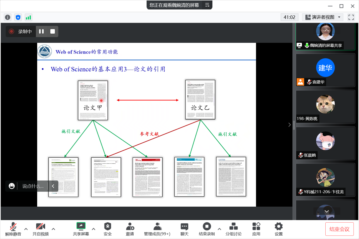 魏婉清结合自己的研究方向,介绍了“Web of science”科睿唯安的学术信息整合平台,指导同学们如何应用数据库、如何提升自己的科研素养。她希望同学们积极利用好各个平台,阅读前沿的有影响力的文献,不断探索研究和实践创新,积累厚实基础,及早做出科研成果。