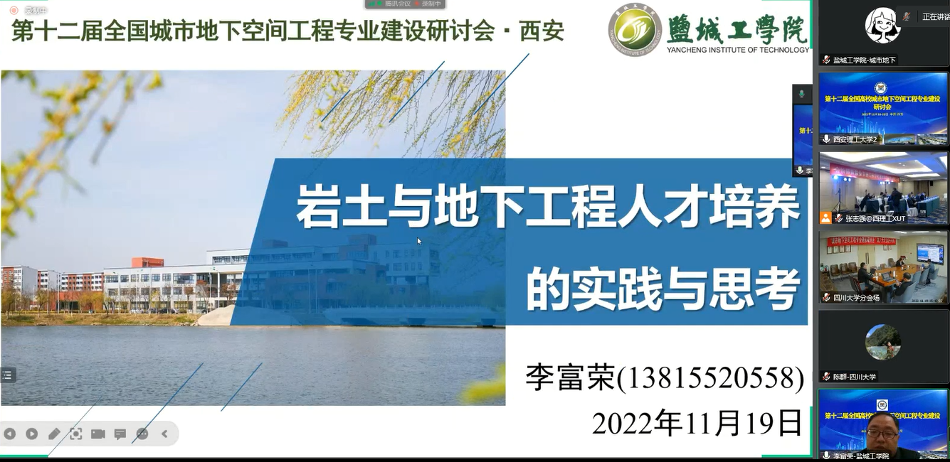 11月18日-20日,由教育部高等学校土木工程专业教学指导分委员会、中国岩石力学与工程学会主办,西安理工大学承办的第十二届全国高校城市地下空间工程专业建设研讨会以线上方式举行。我校在土木馆报告厅设立卫星分会场,土木工程学院副院长李富荣教授代表我校作“岩土与地下工程人才培养的实践与思考”主题报告,介绍我校城市地下空间工程专业人才培养的做法与成效。土木工程学院城市地下空间工程专业80余名师生参加会议。