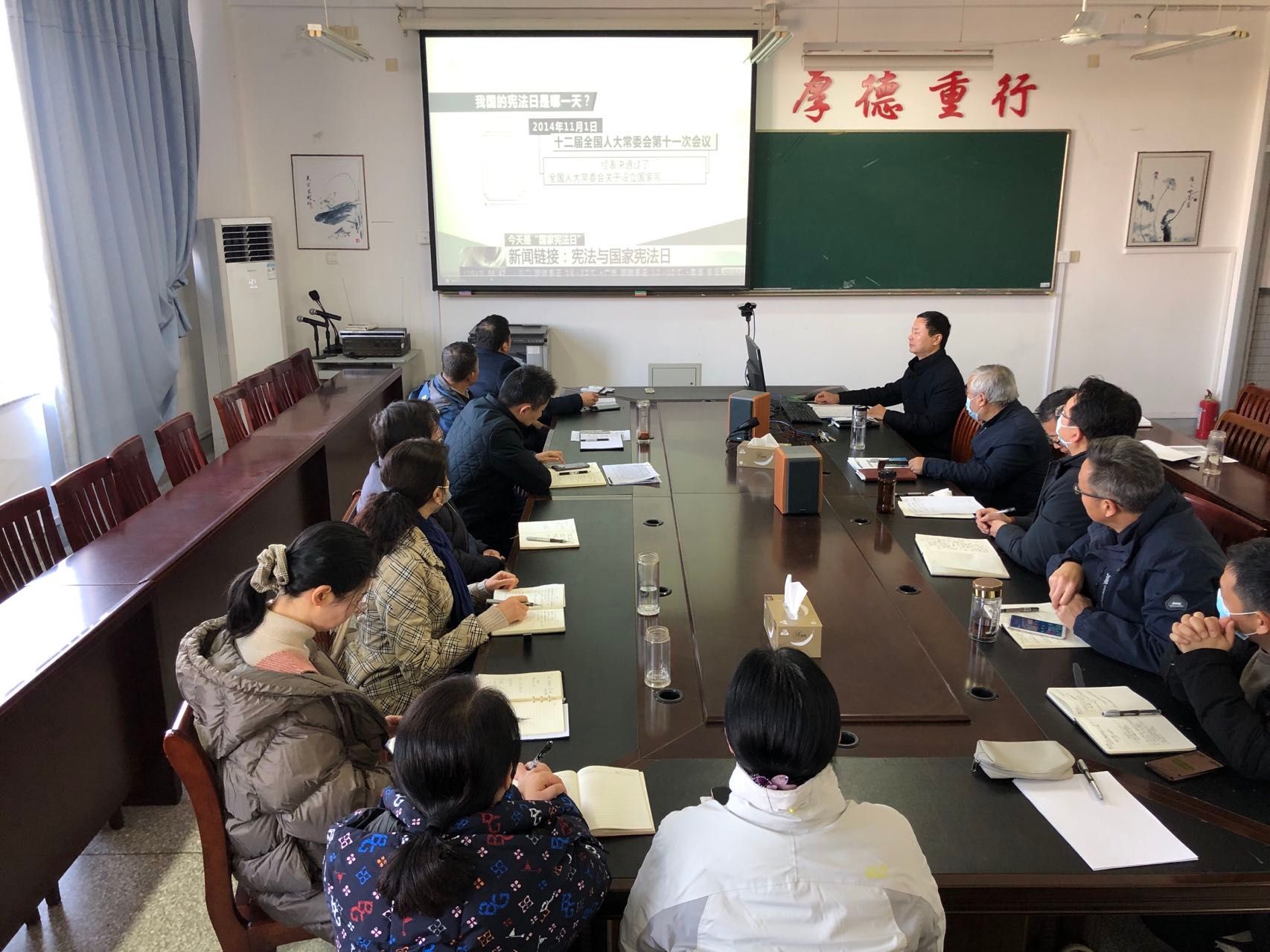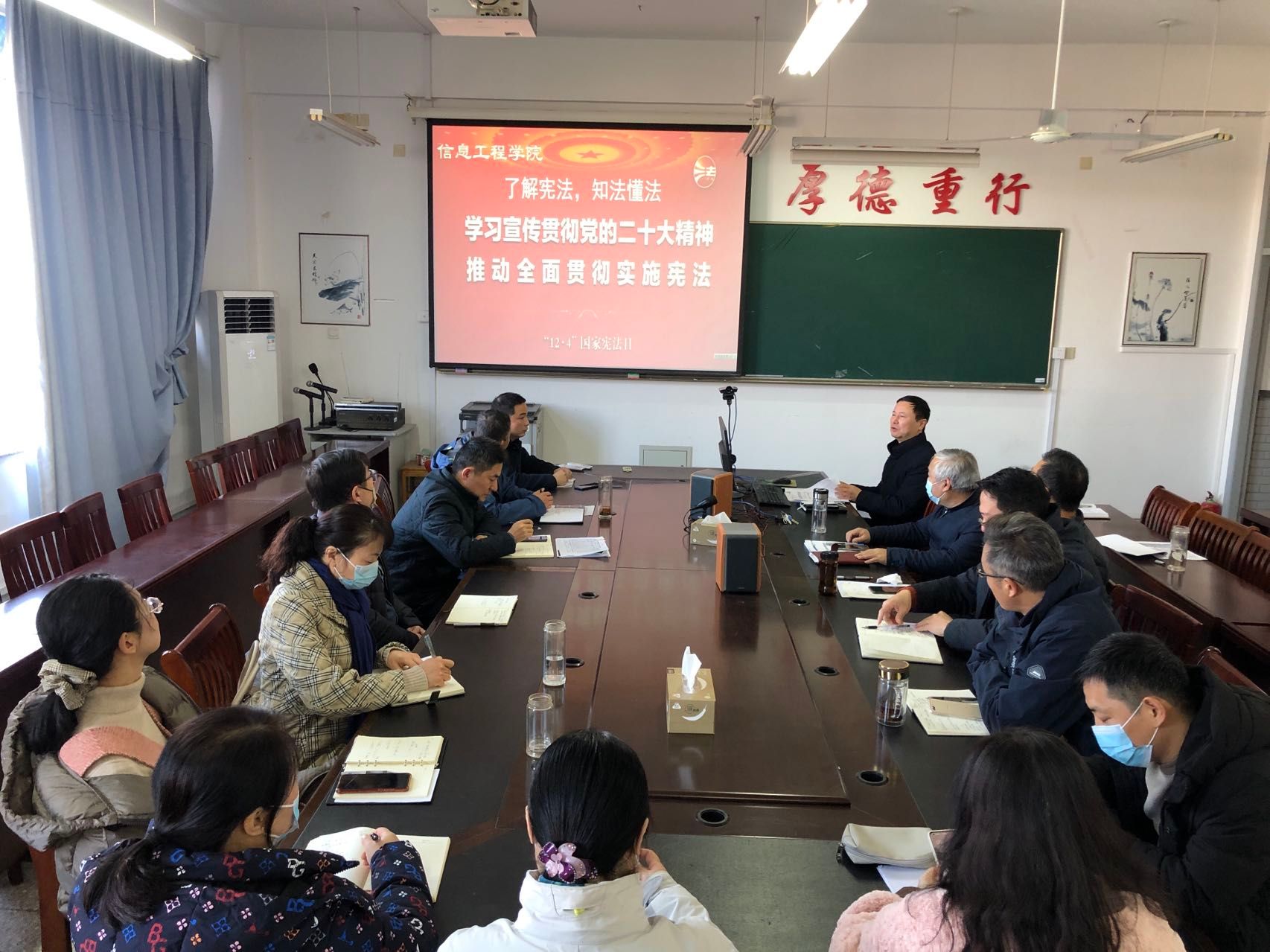 为了增强宪法意识,弘扬宪法精神,加强宪法实施,全面推进依法治国,建设社会主义法治国家,12月7日下午,信息学院在希望大道校区怀德楼B410会议室,组织开展“学习宣传贯彻党的二十大精神,推动全面贯彻实施宪法”主题活动。活动由学院党委书记王爱军主持,全体教职工参加。